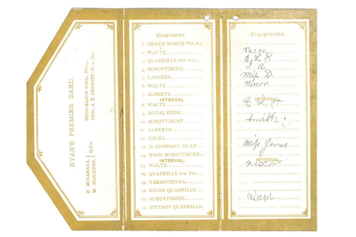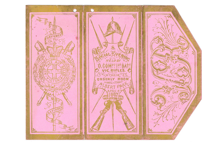 Dance card for a social evening held by the D Company 1st Battalion Victorian Rifles, held in Albert Park, April 4th 1887 (Port Phillip Heritage Centre collection)