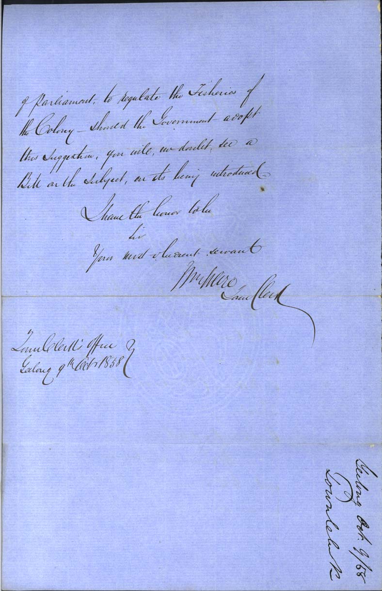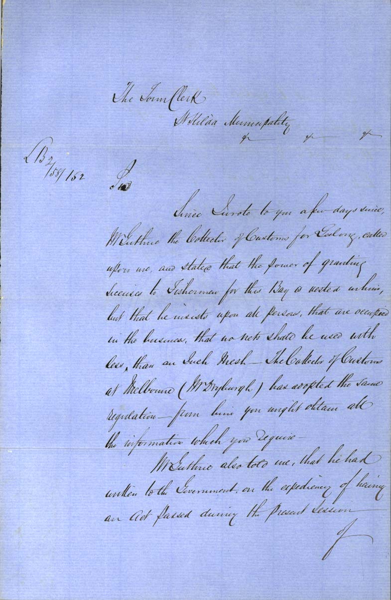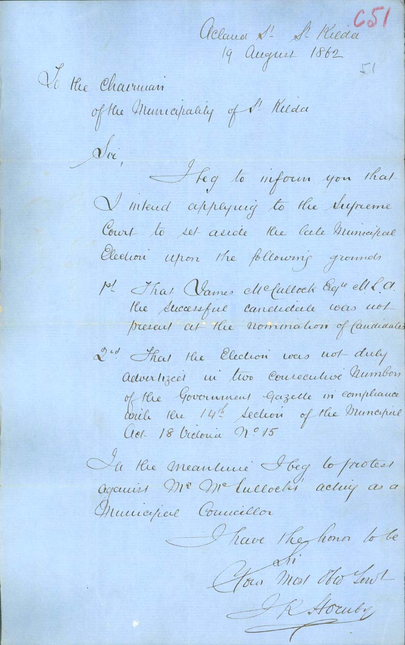 27. July, 1858 Town Clerk, Emerald Hill enclosing his Council's resolution suggesting that all Municipalities make some recognition of the part played by the Hon. Captain Clarke MLA (on his departure for England) in securing the passing of the Municipal Institutions Act by which local self-government was established.