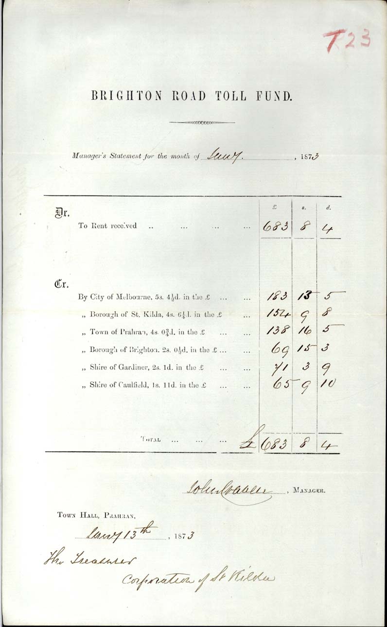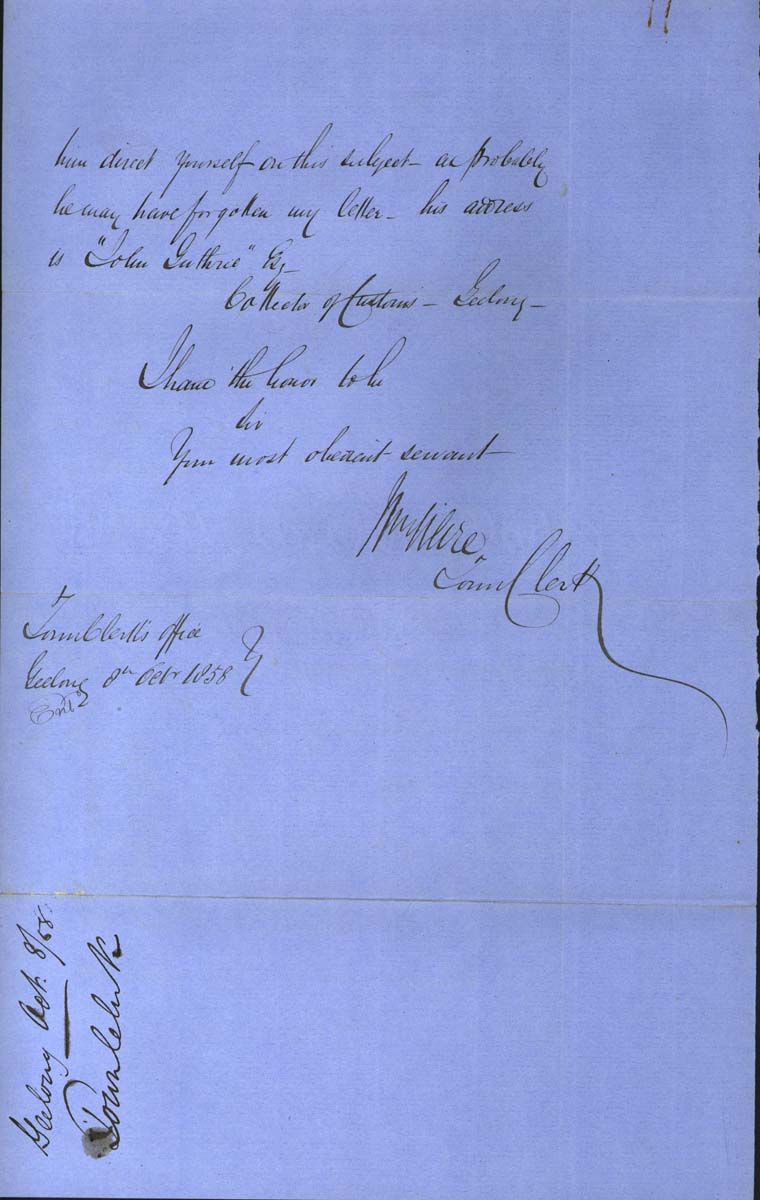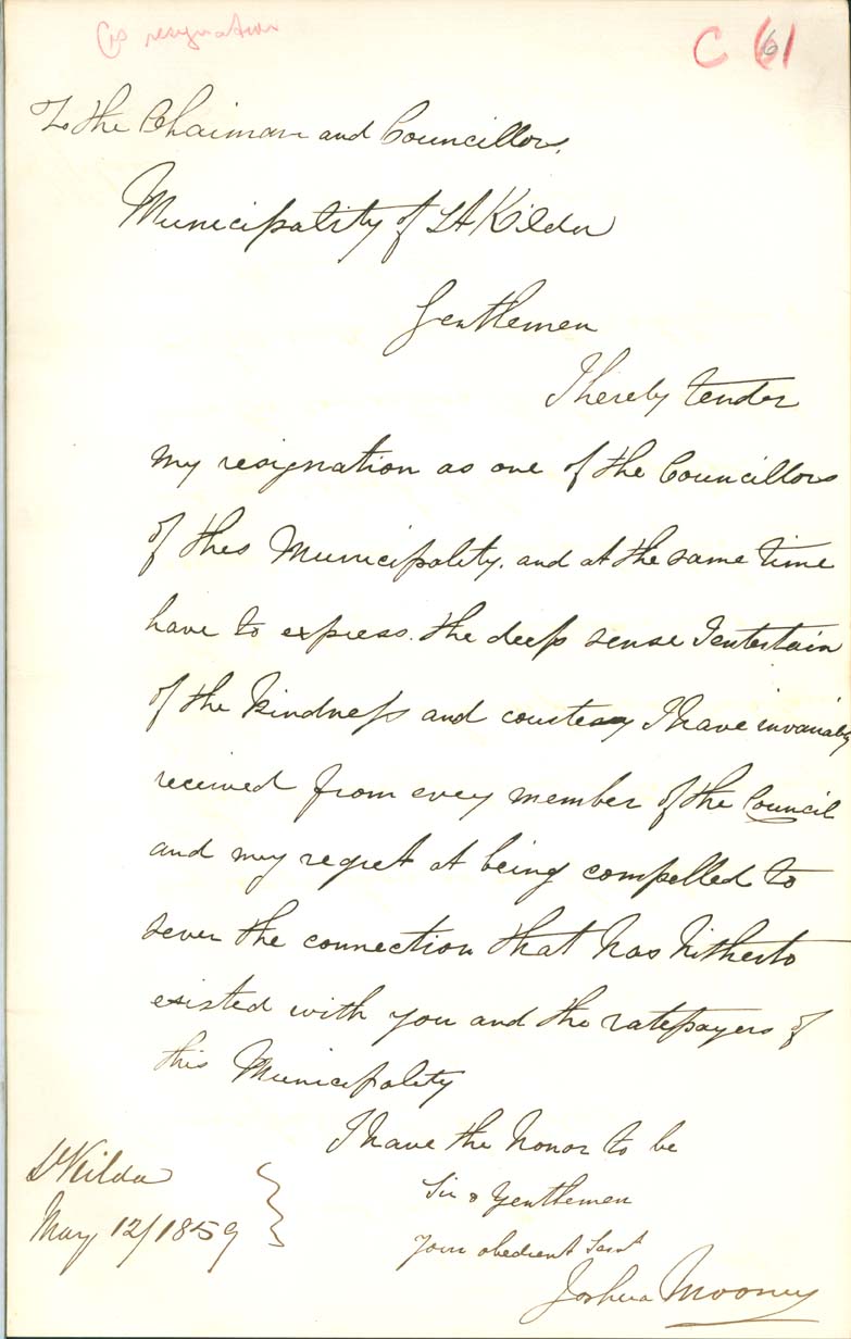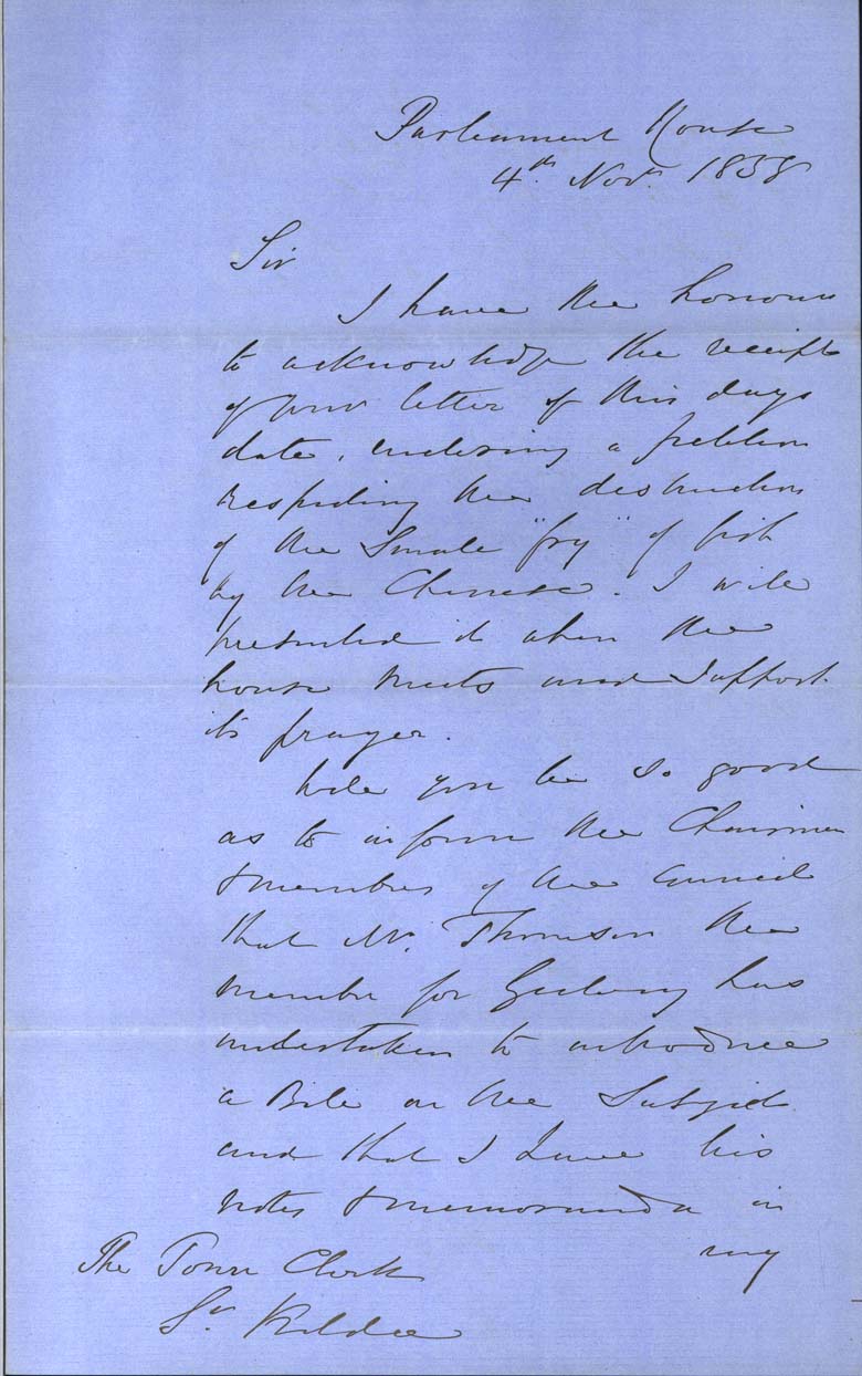 27. July, 1858 Town Clerk, Emerald Hill enclosing his Council's resolution suggesting that all Municipalities make some recognition of the part played by the Hon. Captain Clarke MLA (on his departure for England) in securing the passing of the Municipal Institutions Act by which local self-government was established.