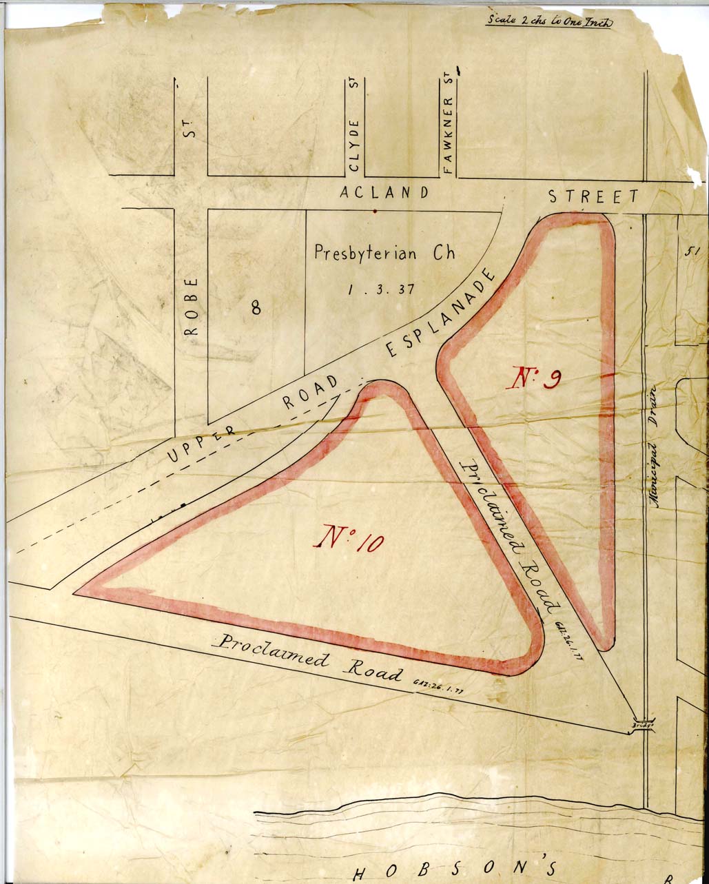 50. April, 1885 W Murray Ross suggesting the erection of a wicker-work pallisading seaward of the shoreline from Point Ormond northwards and the area enclosed (as shown on plan) be used as a Marine Park and pleasure ground which together with the filling of the Elwood Swamp and the building of his proposed Railway from Elwood to St Kilda would enhance property values.