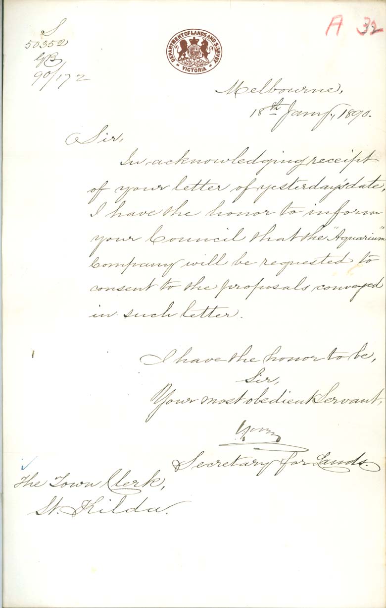 32. January, 1890 Department of Lands & Survey advising that the Aquarium Company will be requested to consent to proposals conveyed in the Council letter of 17th January 1890. A copy of this letter is available: HistRec-A32a HistRec-A32b