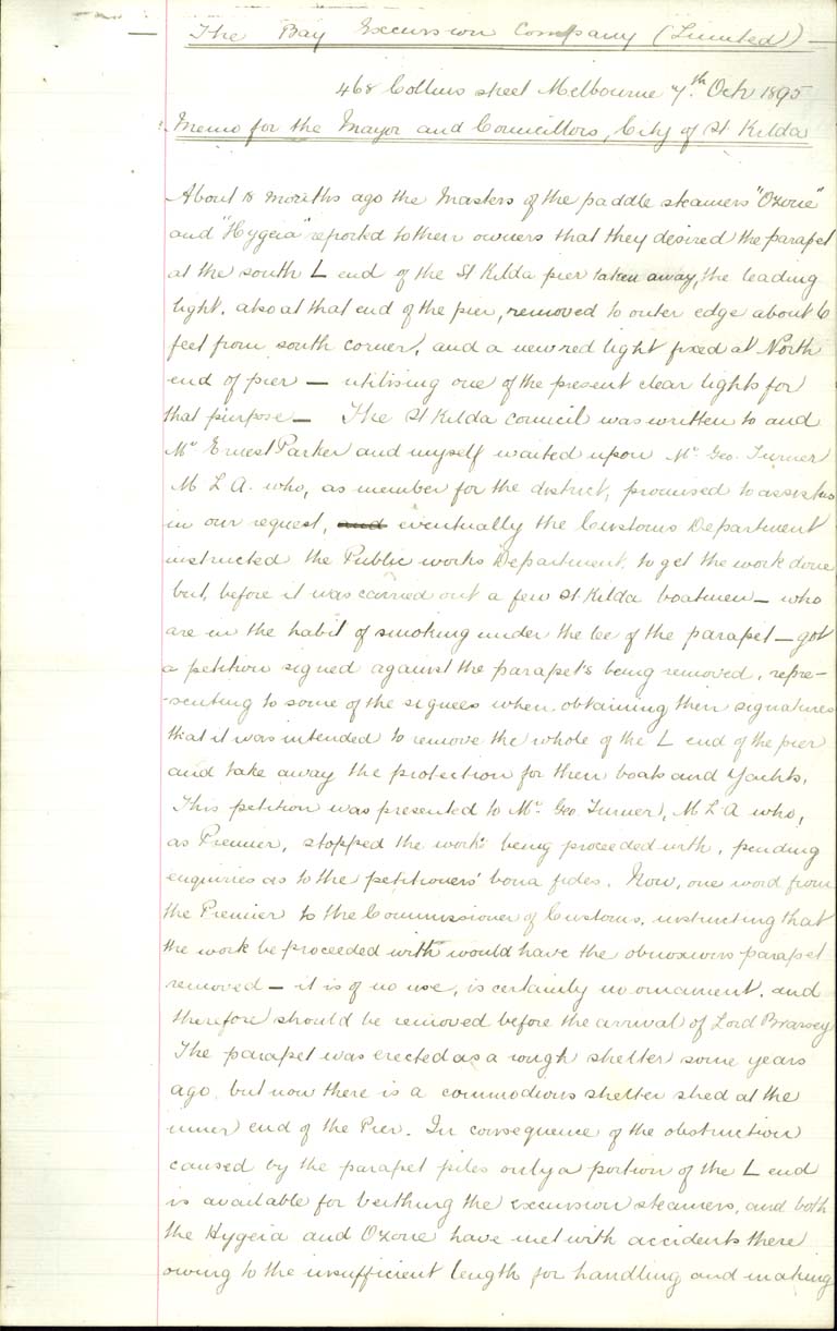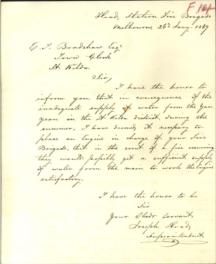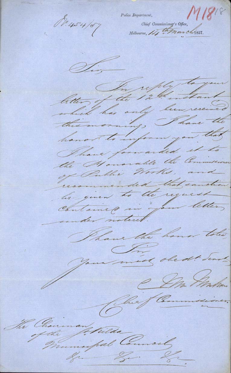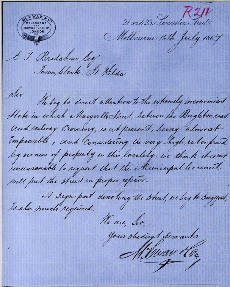 Larger collections of early correspondence have survived from the City of St Kilda than from our other two former cities, South Melbourne and Port Melbourne. This particular collection was organised and indexed by W.H. Greaves, a former Town Clerk of St Kilda. For enquiries concerning historical documents from any of the three previous councils, please contact Local History Services.