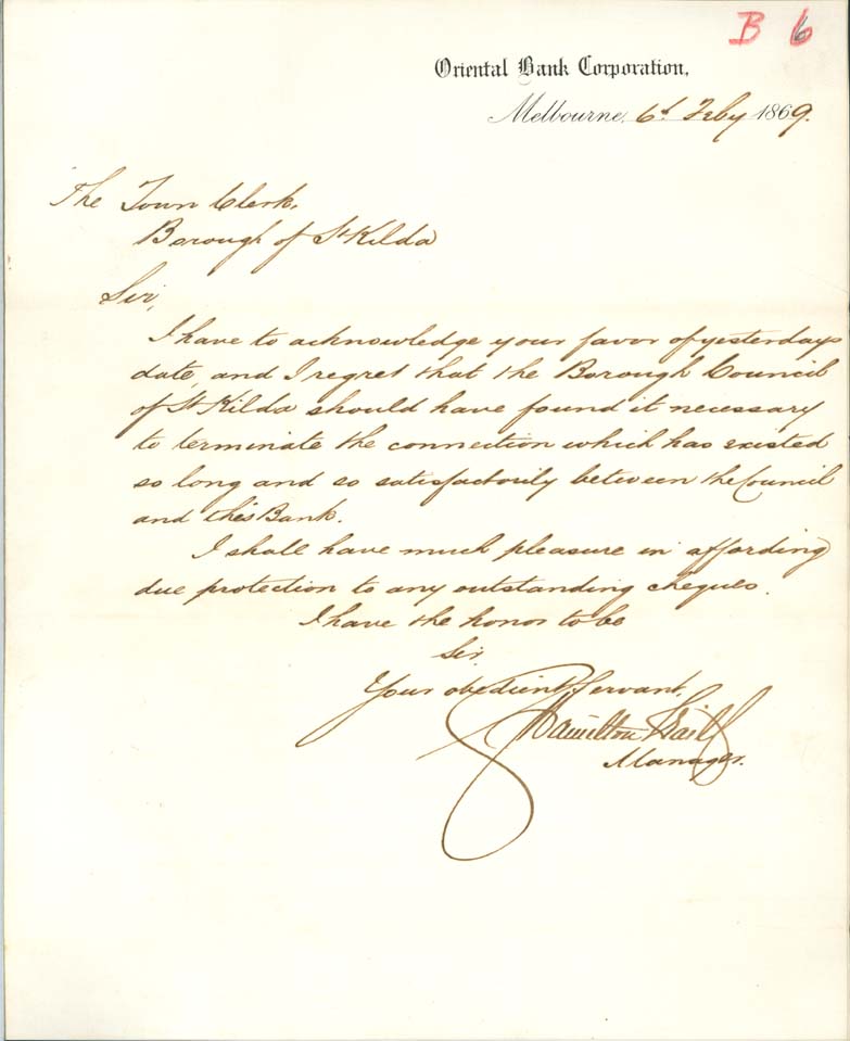 6. February, 1869 Oriental Banking Corporation acknowledging the Council's letter terminating its association with the Bank. A copy of this letter is available: HistRec-B6a HistRec-B6b