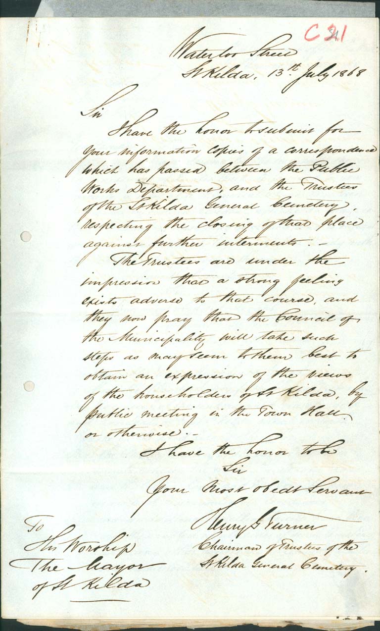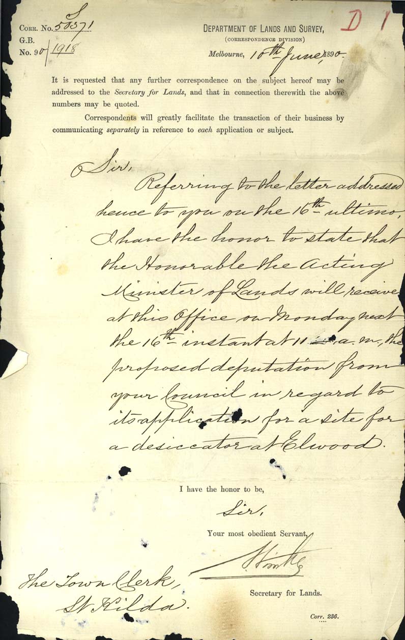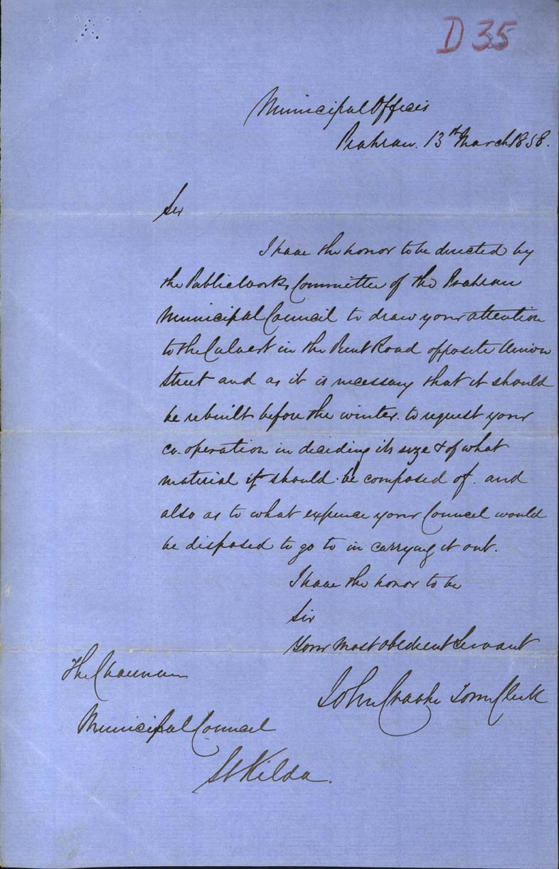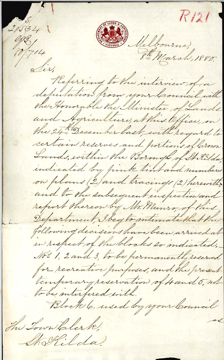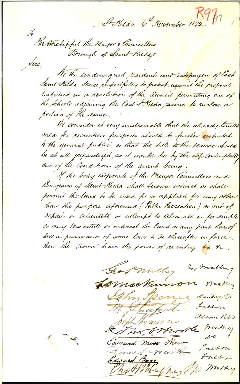 This index provides access to some of our earliest letters and other documents dating from the period between the formation of the St Kilda municipality in 1857 and the early 20th century. The correspondence provides a unique snapshot of the concerns of St Kilda residents and Council during this time.