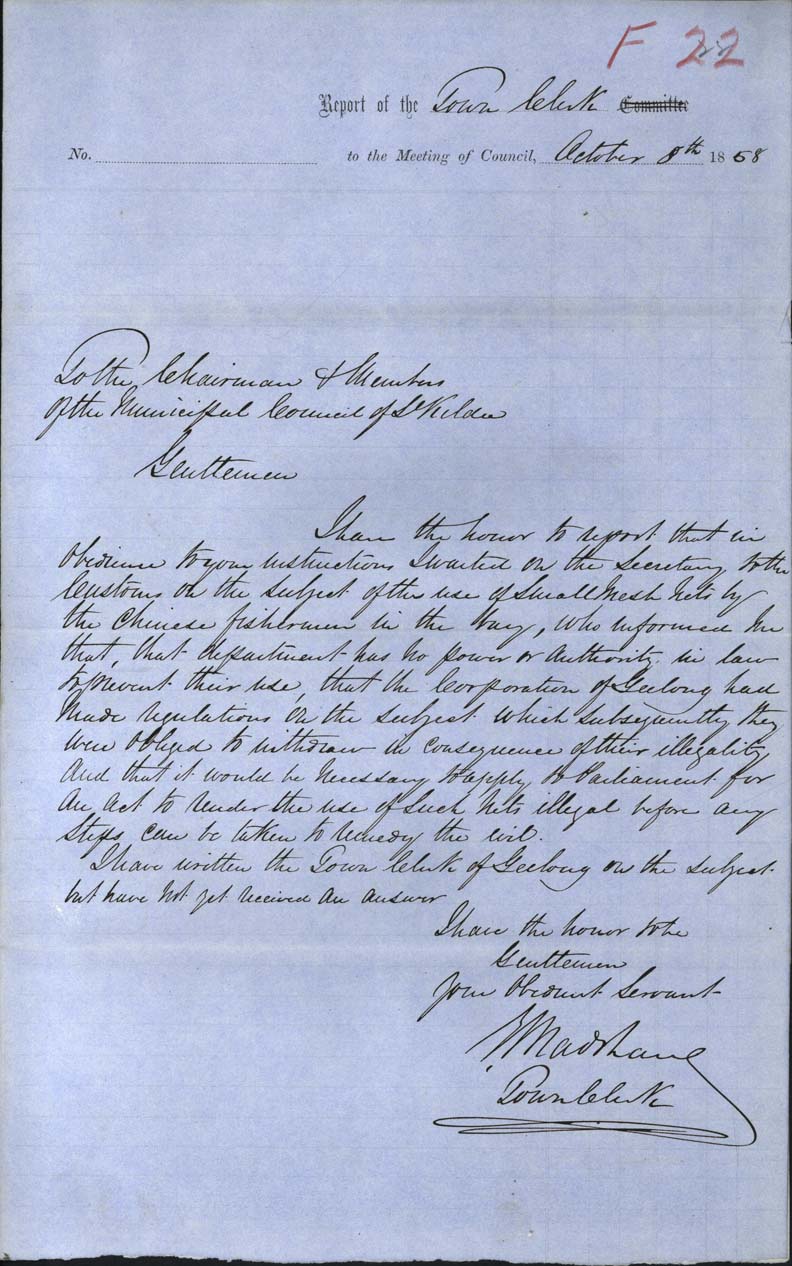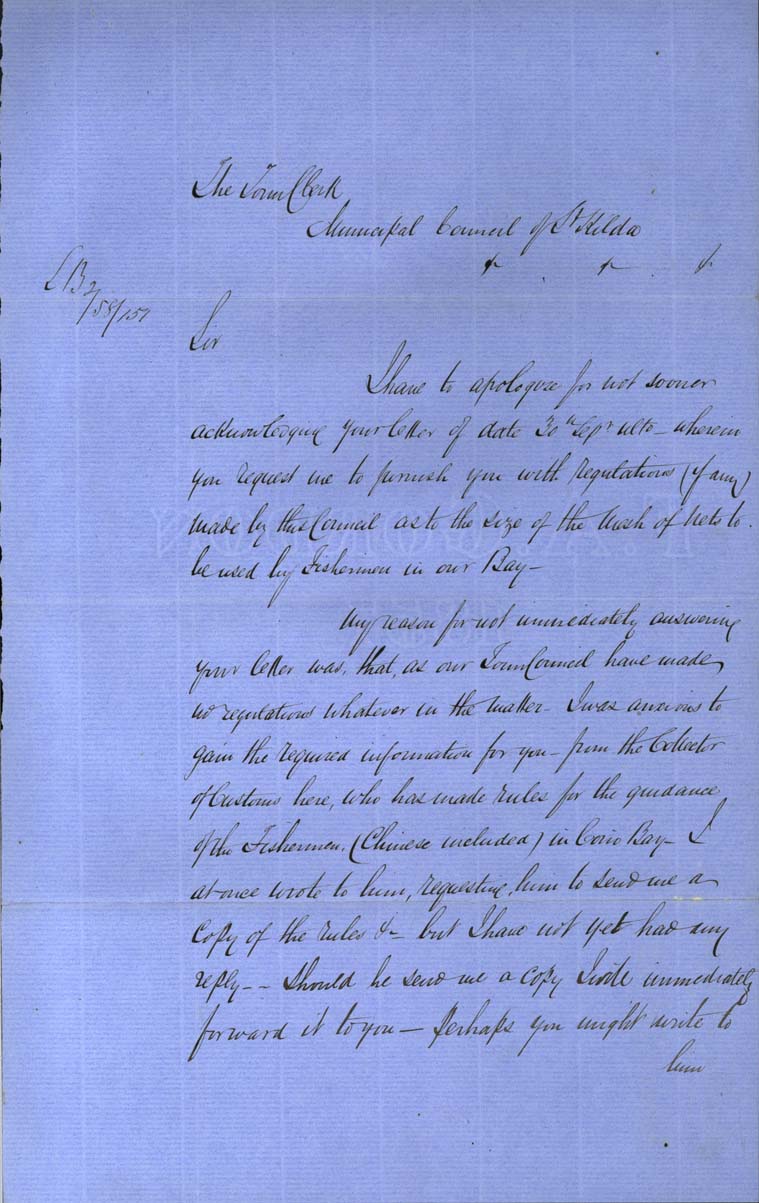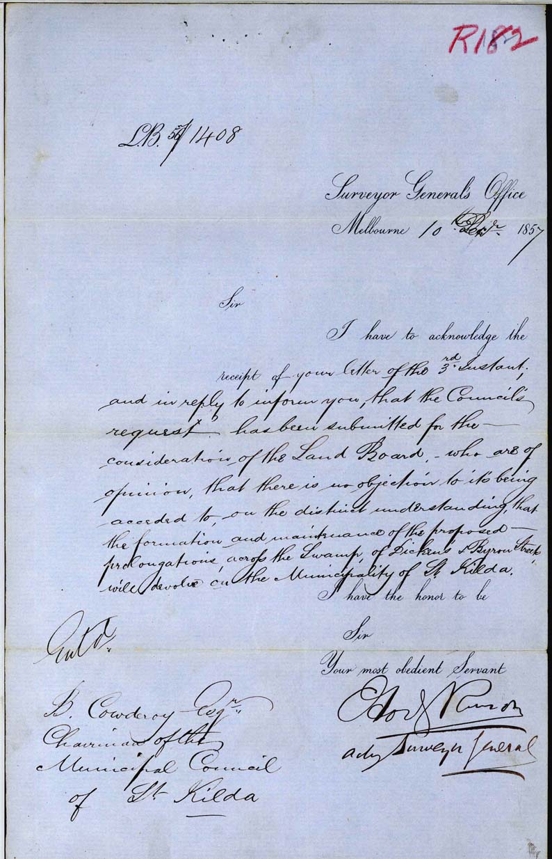 48. February, 1858 Crown Lands Office replying to Councillor Cowderoy's protest concerning the erection of tents and other structures on the St Kilda beach and at the conduct of Chinamen occupying them.