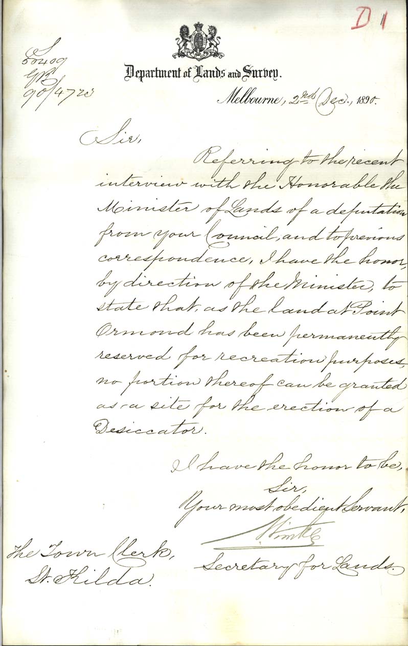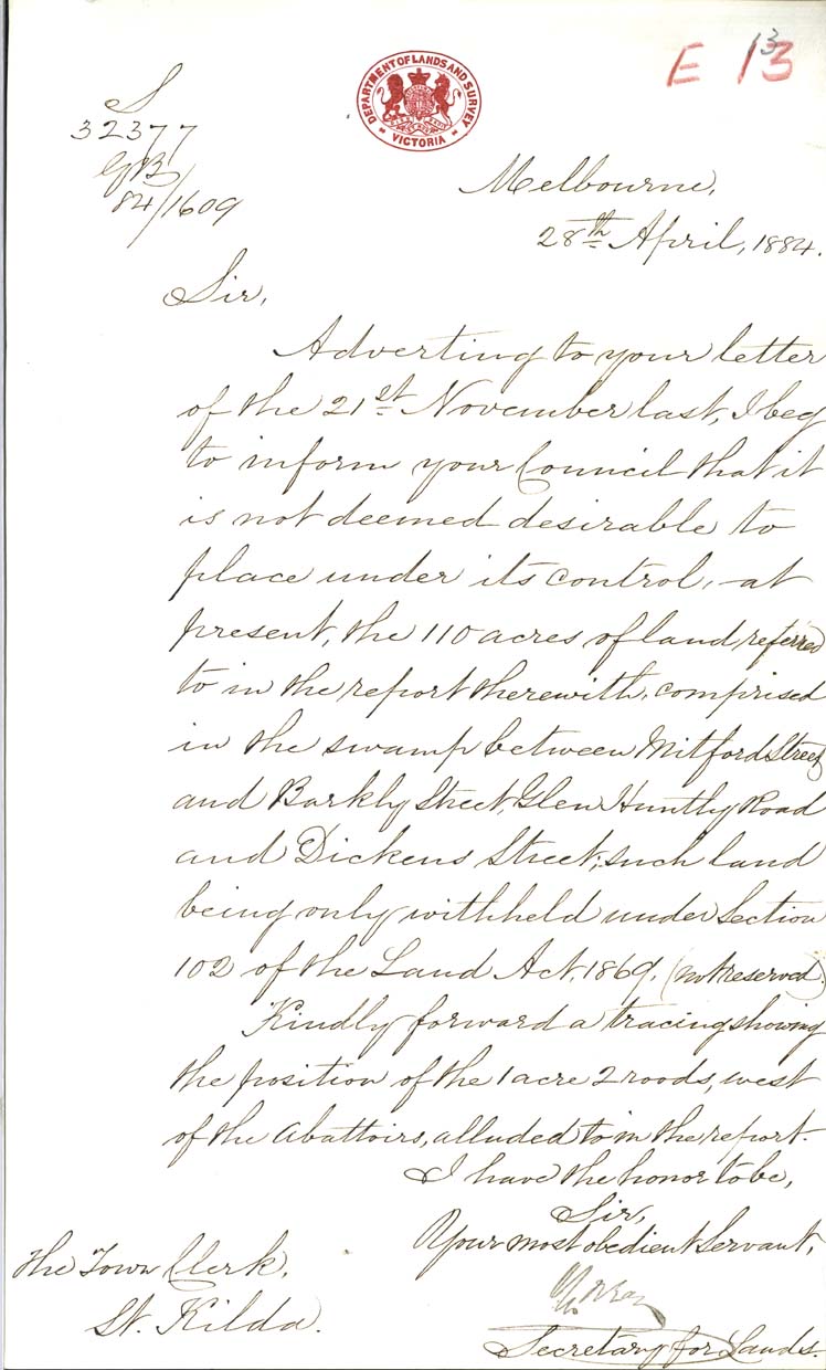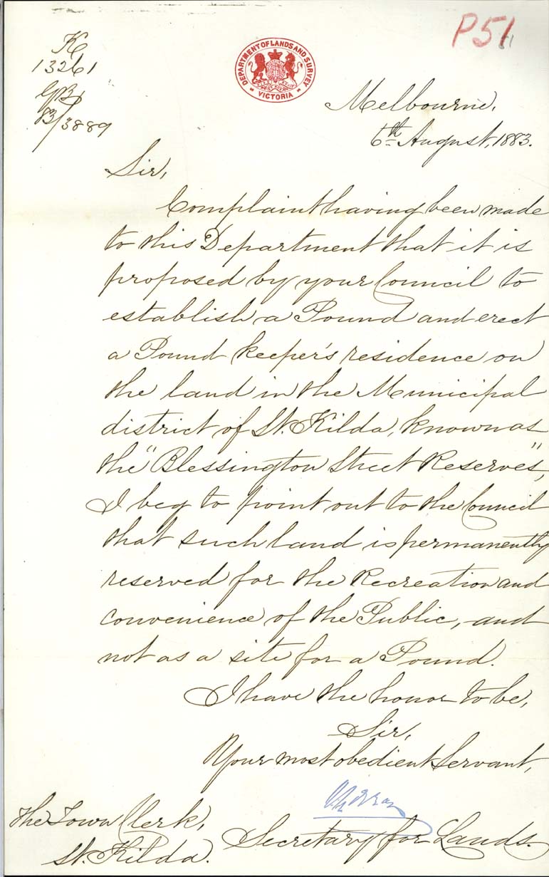 42. November, 1878 Department of Lands & Survey indicating that the Council could not legally lease land comprised within the St Kilda Town Common for grazing purposes.