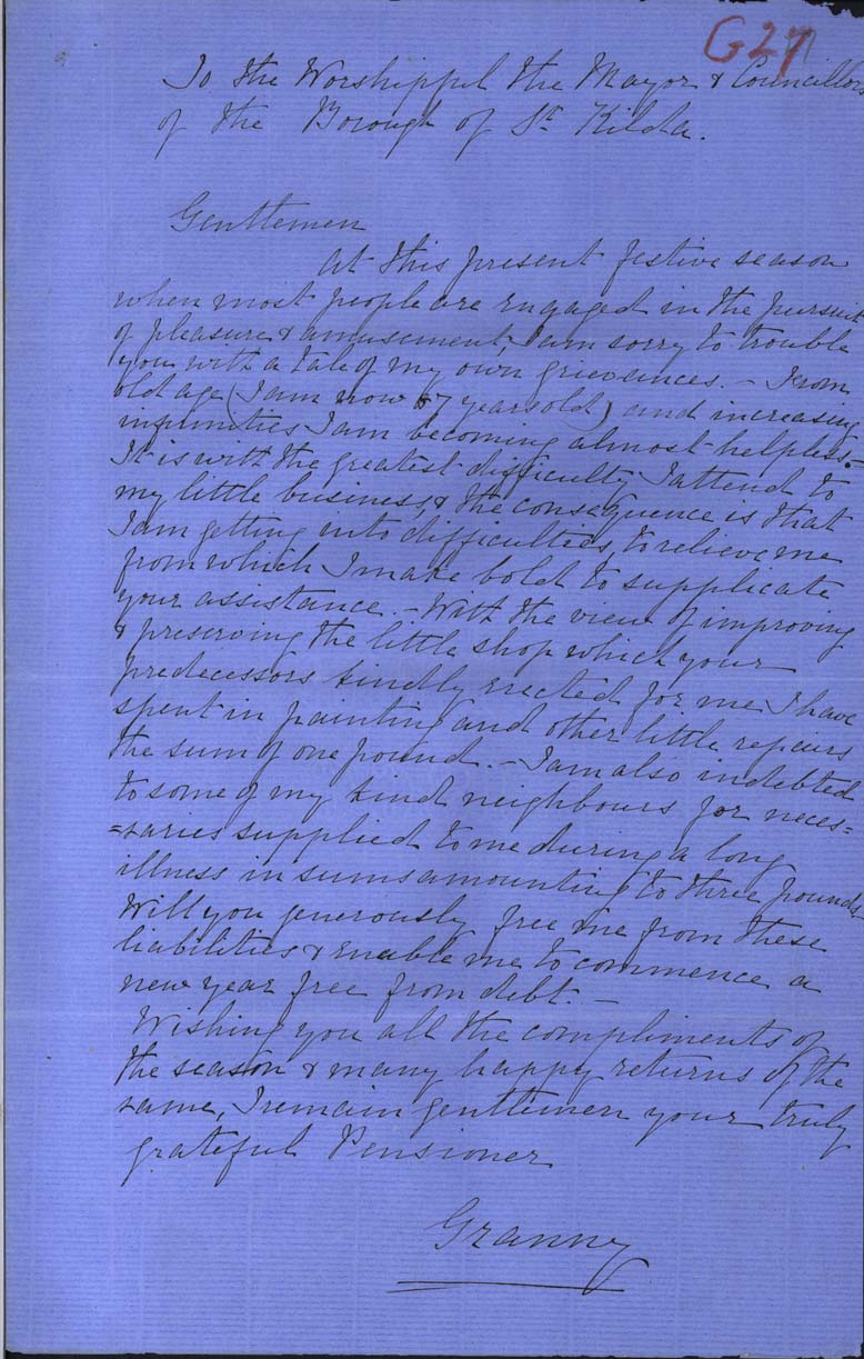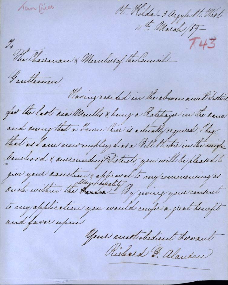 43. March, 1859 Richard Alanson of Argyle Street seeking the Council's sanction and approval to him becoming a Town Crier. A copy of the letter is available: HistRec-T43a HistRec-T43b
