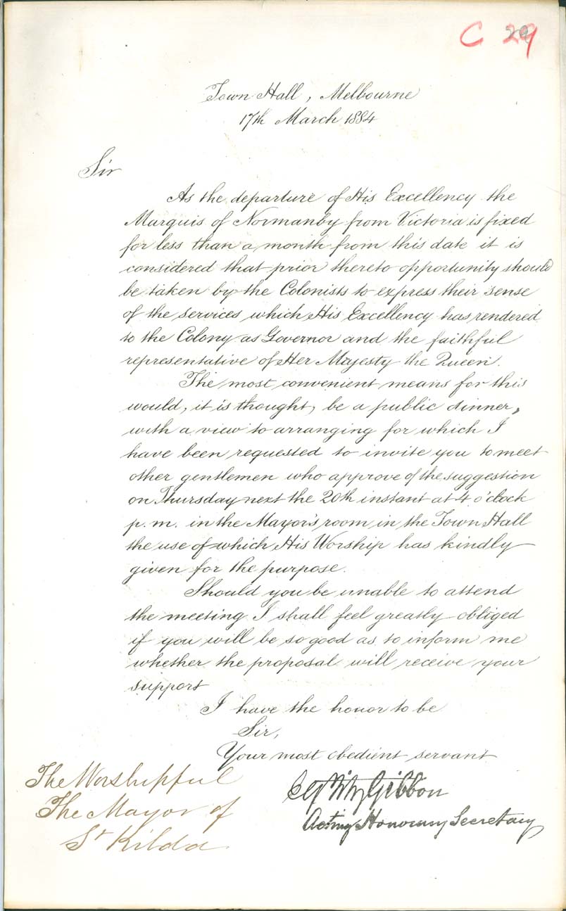 26. June, 1883 Mayor of Melbourne asking that consideration be given to offer by the Government to formulate a scheme for establishing a Metropolitan Board of Works to deal with Water Supply, Sewerage etc.
