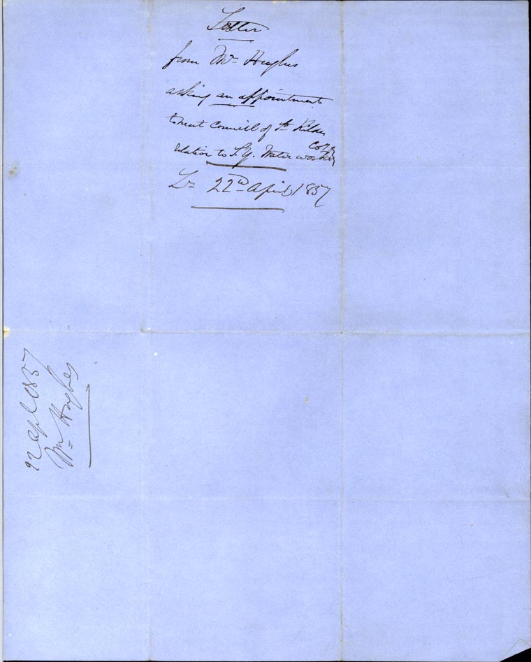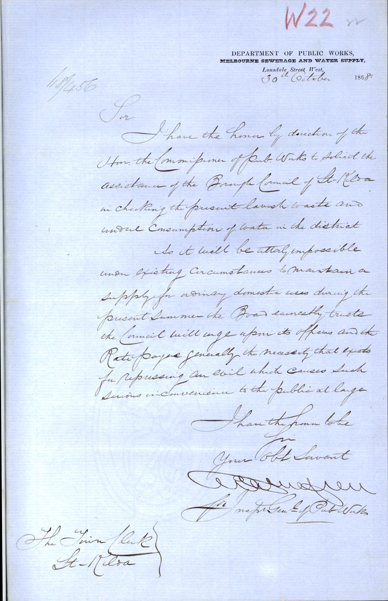 22. October, 1868 Department of Public Works seeking assistance in bringing to the notice of residents, the need for checking the present lavish waste and undue consumption of water. A copy of the letter is available: HistRec-W22a HistRec-W22b