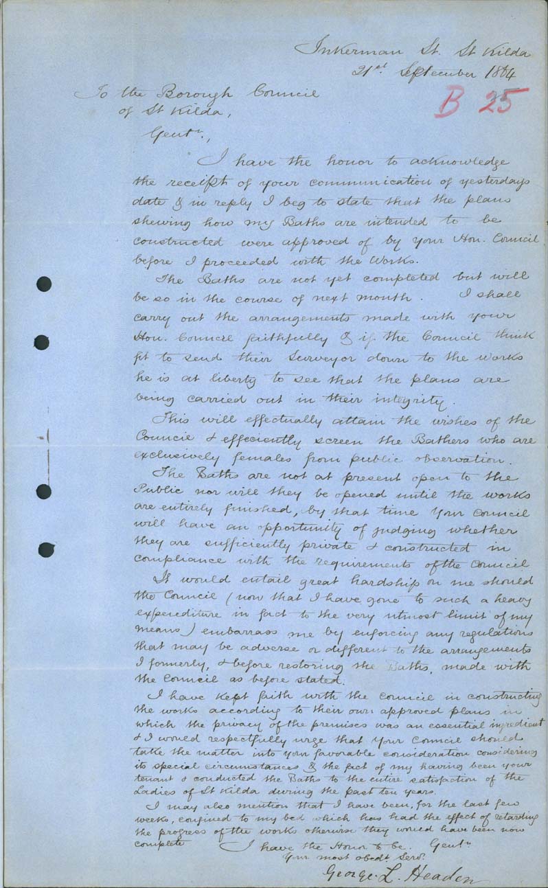 25. September, 1864 George L Headen on the subject of screens in his baths under construction to provide that females will be effectively hidden from public view. A copy of this letter is available: HistRec-B25a HistRec-B25b