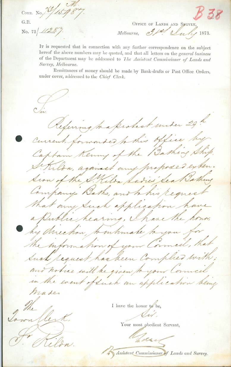 38. July, 1873 Department of Lands & Survey - objection by W Kenney to any site extension being granted to St Kilda Ladies Sea Bathing Co. A copy of this letter is available: HistRec-B38a HistRec-B38b