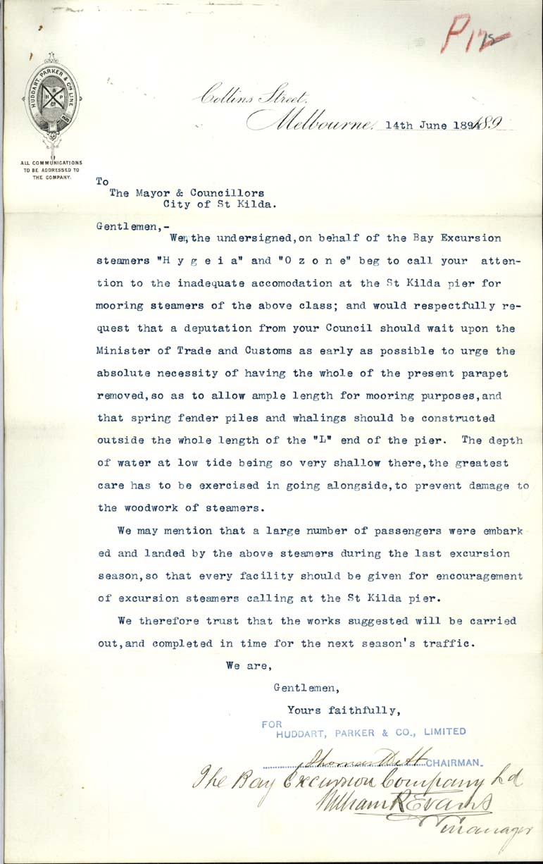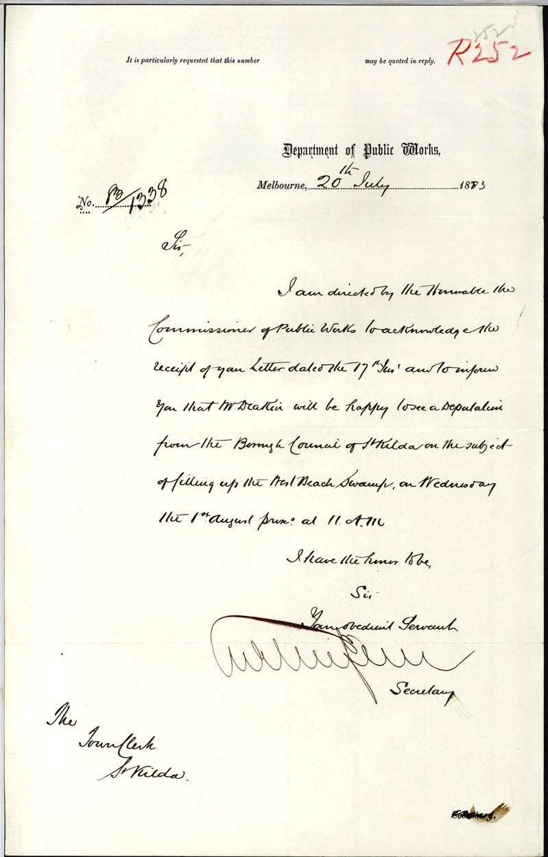 3. March, 1857 Secretary Melbourne and Hobsons Day Railway Co asking permission to lay down water pipes from the Tank (owned by the South Yarra Water Works Co) neat the St Kilda Junction across Melbourne Road (St Kilda Road) and along Fitzroy Street to the Railway Station.