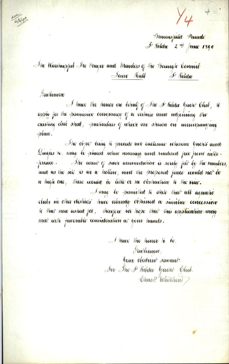 4. June, 1890 Chas. P Whitehead applying on behalf of the St Kilda Yacht Club for permissive occupancy of an area adjoining the existing Club shed to provide an enclosure for yachts and dinghies. A copy of the letter is available: HistRec-Y4a HistRec-Y4b