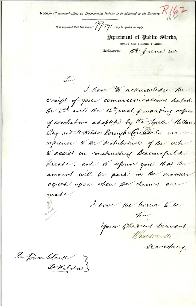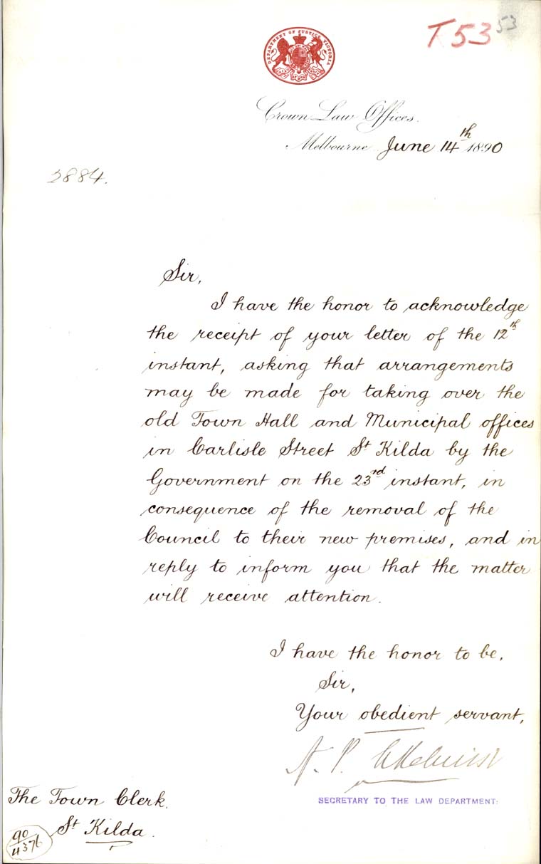 53. June, 1890 Crown Law Department acknowledging the Council's advice that it has moved to the new Town Hall (corner Brighton Road and Carlisle Street) and may now take over the old Town Hall. A copy of the letter is available: HistRec-T53a HistRec-T53b