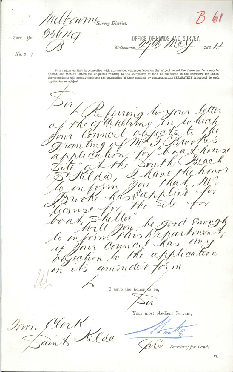 3. March, 1885 Department of Trade and Customs seeking the Council's views on the application by the Victoria Yacht Club for a Clubhouse site north of the St Kilda Pier.