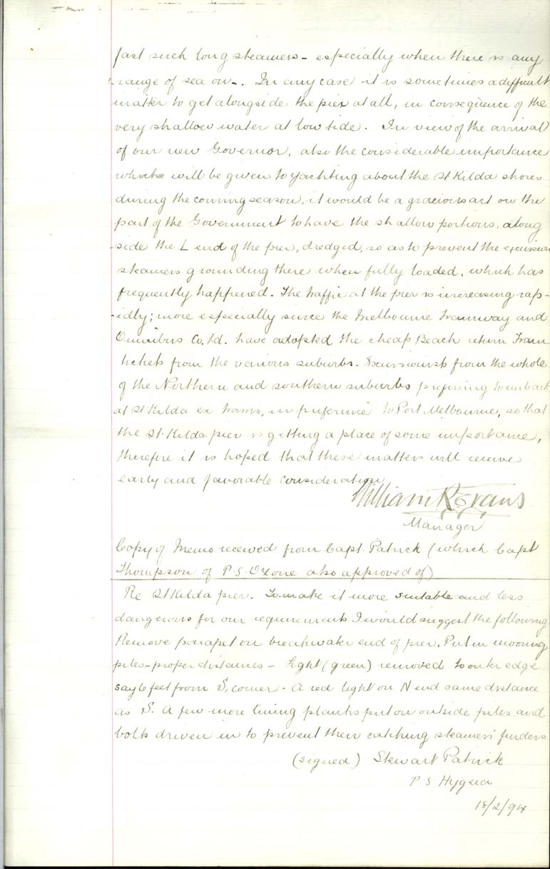 39. October, 1873 Department of Lands & Survey - two letters advising that Captain Kenney has been given permission to extend his "Bathing Ship" baths on the understanding that he effectively screen them from the pier. Subsequently agreeing to receive a deputation from the Council on this subject and the suggested abolition of the St Kilda Pound corner Alma Road and Mort Street.