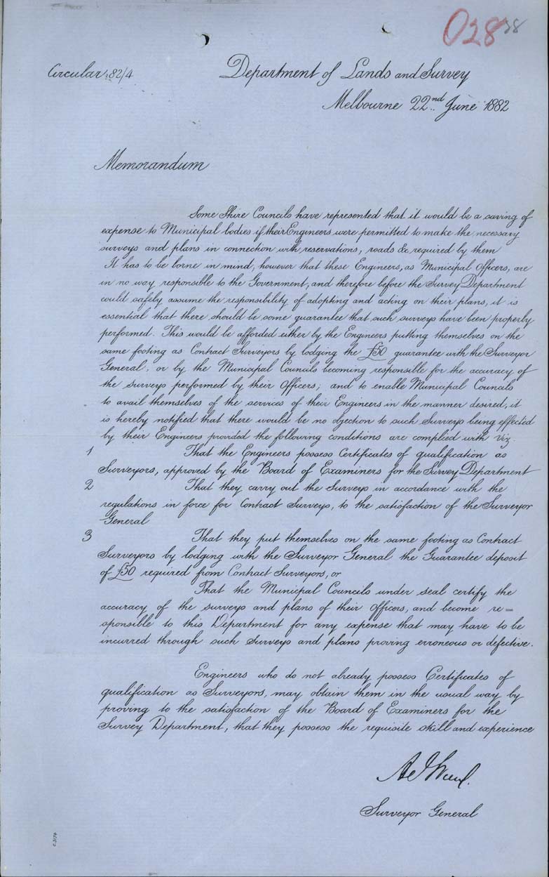 64. June, 1888 Department of Lands & Survey stating that the issue of a Crown Grant of the site at the corner of Brighton Road and Carlisle Street will be held over until after the new Town Hall has been built.