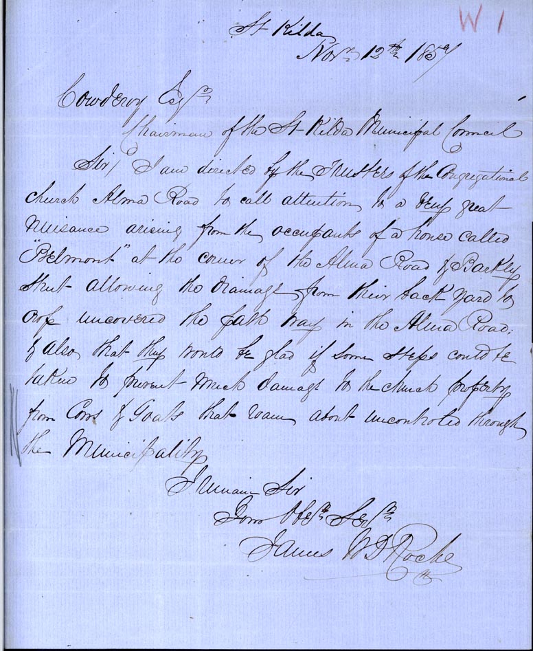 1. November, 1857 Mr J Roche for Trustees of Congregational Church, Alma Road (adjacent to corner of Alma Road and Barkly Street) concerning damage to Church property by roaming cows and goats. A copy of the letter is available: HistRec-W1a HistRec-W1b