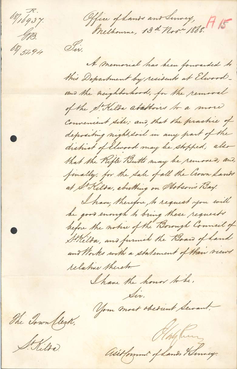 15. November, 1868 Department of Lands & Survey asking Council's views on a petition by residents seeking the removal of the abattoirs - also the removal of the Rifle butts. A copy of this letter is available: HistRec-A15a HistRec-A15b