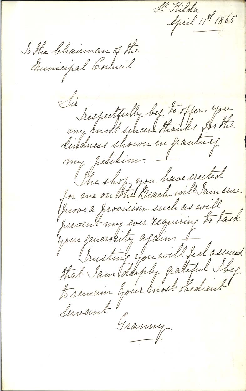 22. September, 1864 J Hegarty replying to Council's request that a screen be erected to screen bathers from public view.