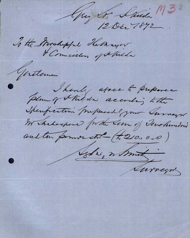 21. September, 1866 James Robertson advising that the Government will lay water supply to Smith Street as soon as the street levels are completed.