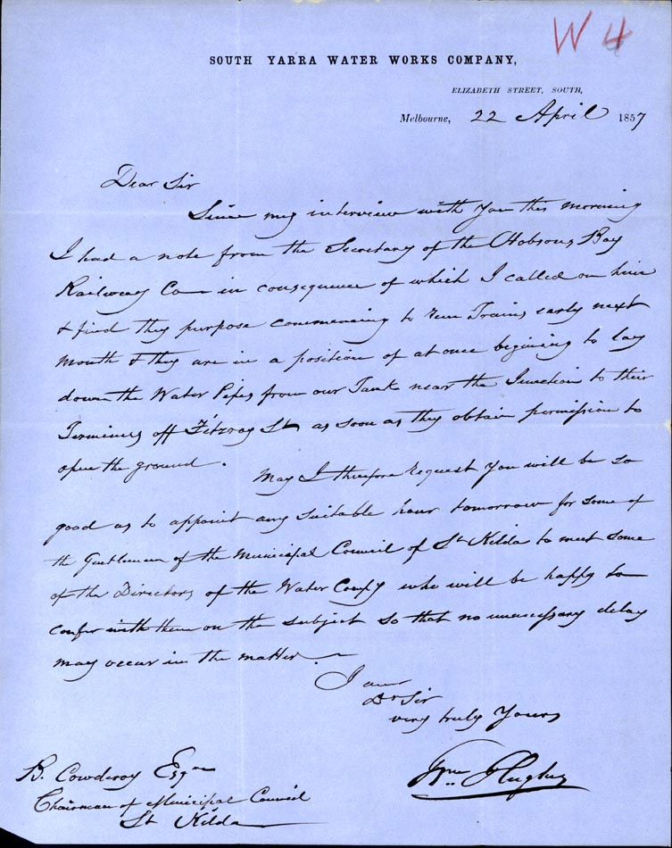4. April, 1857 Secretary South Yarra Water Works Co relative to the Melbourne and Hobsons Day Railway Company's proposal to run trains from St Kilda and its desire to lay water pipes from the Company's tank at the Junction. A copy of the letter is available: HistRec-W4a HistRec-W4b